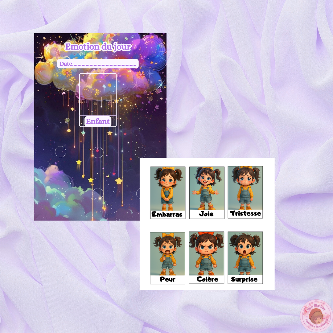 Chaque jour, l’enfant choisit l’émotion qui correspond à son ressenti et l’indique sur le tableau à l’aide des pastilles prévues à cet effet. Un espace est également réservé pour noter la date et le prénom de l’enfant, afin de personnaliser le suivi.