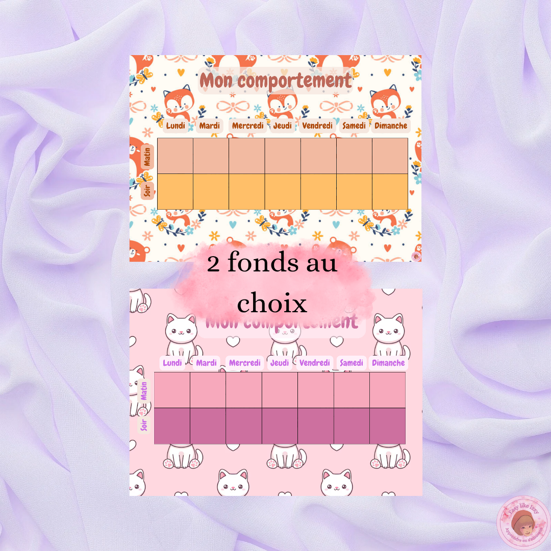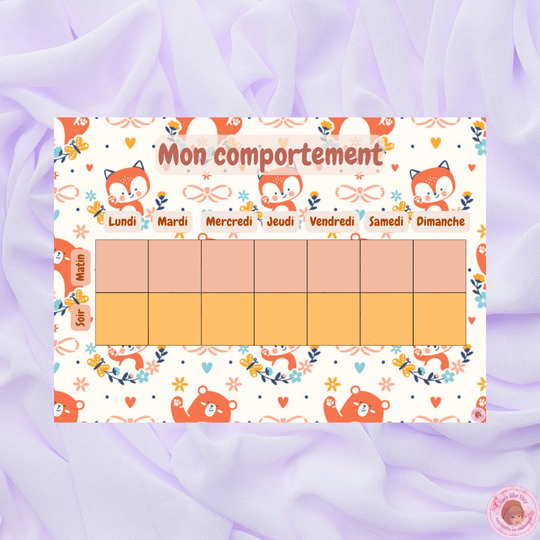 Ce tableau permet de suivre le comportement de l’enfant chaque matin et chaque soir de la semaine. Grâce à son design mignon et ses motifs joyeux, il motive l’enfant à progresser tout en rendant le suivi amusant.